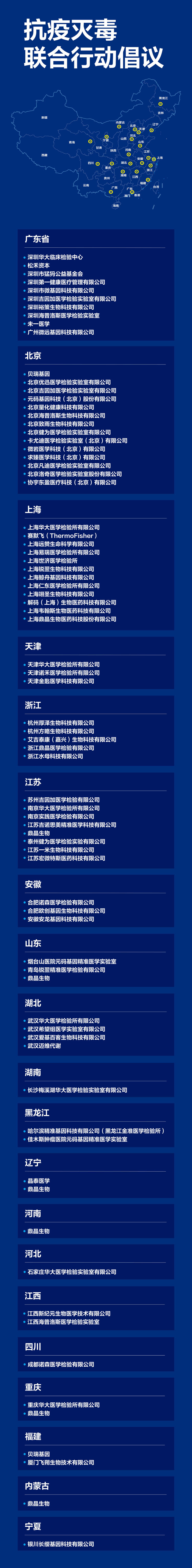 截至目前,已经有53家企业共同倡议,愿意暂停正在进行的部分科研工作和业务运营,为抗疫灭毒提供PCR实验室、基因扩增检验实验室、P2实验室、CAP认证实验室场地几十处,自动化核酸仪、全自动毛细管电泳仪、测序仪、PCR仪器近百台,检测试剂盒以及专业人员若干以及捐资上千万元,覆盖北京、湖北、辽宁、广东、浙江、江西、福建、上海、黑龙江、天津等18个省市区。