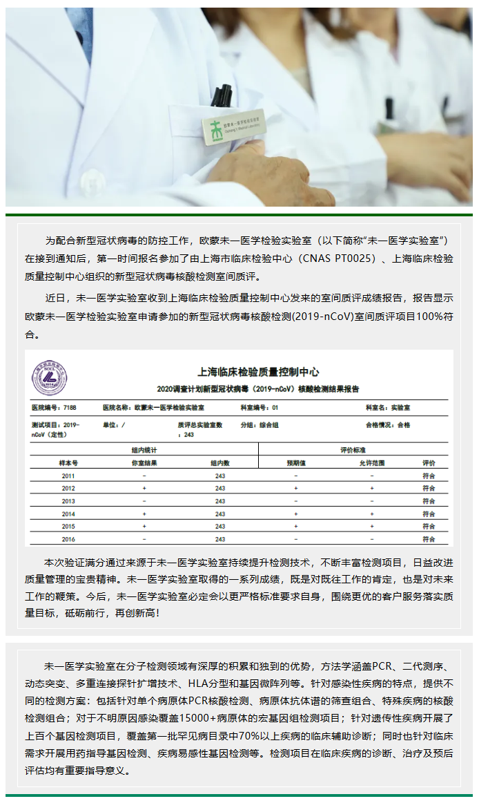 未一医学实验室满分通过新型冠状病毒核酸检测室间质评