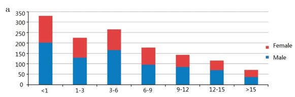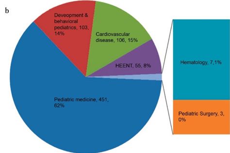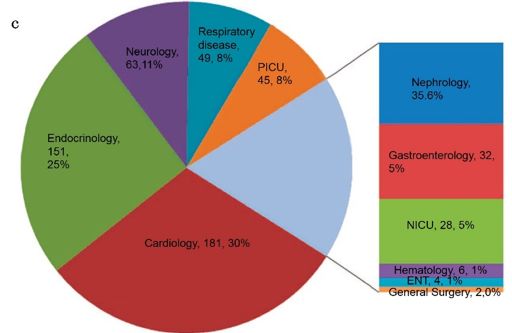 该 研究回顾了自2015年4月至2016年12月在上海儿童医学中心进行医学外显子测序的1323例患者,其中,门诊患者725人,住院患者598人,这些 患者的检测是由136名临床医生进行推荐的。这1323位患者中包含781位男性,542位女性,其年龄结构如图a所示;752位门诊患者的患病类型 中,451位为儿科门诊患者,占门诊患者的62%,紧随其后的是心血管疾病患者106人,占门诊患者15%(见图b);598位住院患者的住院科室如图c 所示,大多数住院患者来自心脏病科室(181人),内分泌科(151人),神经科(63人),呼吸科(49人)等等。该研究按照2015年美国医学遗传学 和基因组学协会(ACMG)提出的变异分类指南对所有入组患者通过医学外显子测序鉴定得到的遗传学变异进行了分类评估。
