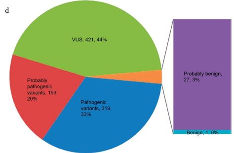 该 项目共检测出了961个变异,研究人员根据2015年ACMG指南对所检出变异进行了分类(见图d),其中意义未明的变异(VUS)占到44%,致病变异 (Pathogenic variants)占33%,可能致病的变异(Probably pathogenic variants)占20%,可能良性的变异(Probably benign)占27.3%,良性变异(Benign)占1%。