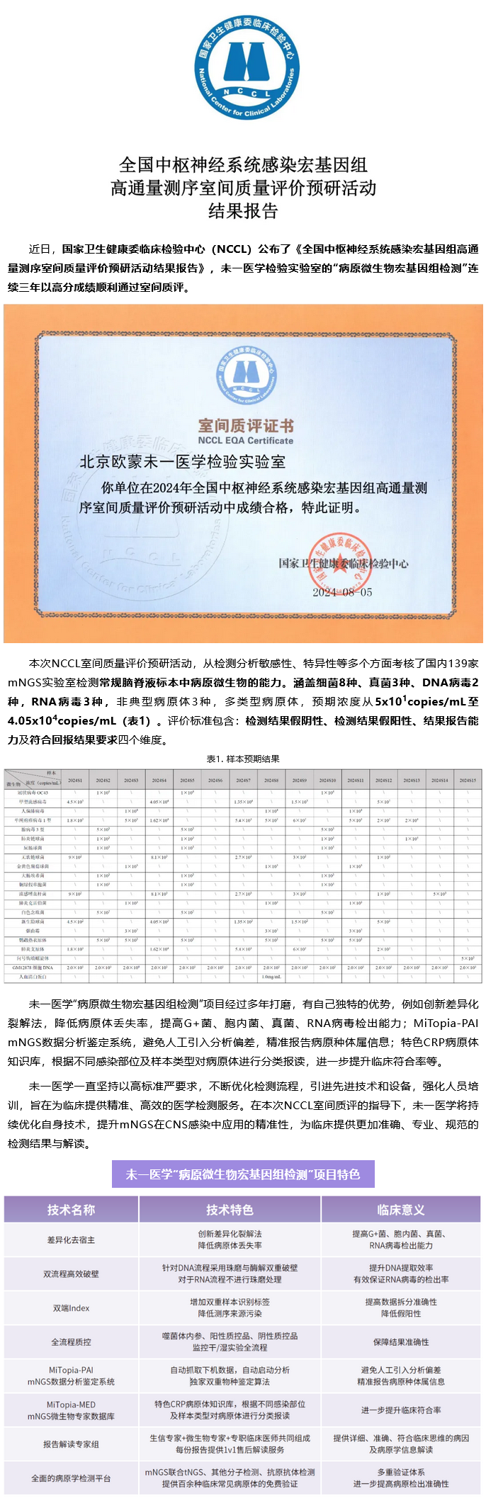 【喜报】未一医学高分通过全国《中枢神经系统感染宏基因组高通量测序室间质评》