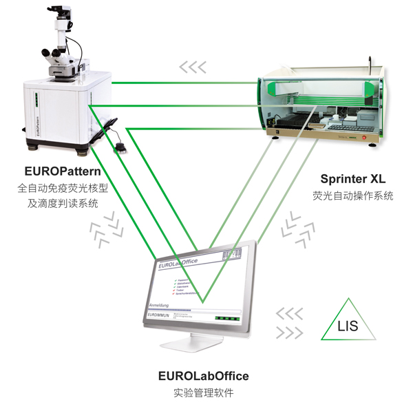 采用全球先进的间接免疫荧光检测平台(IIFT),包括欧蒙荧光全自动操作系统及全自动荧光核型及滴度判读系统,从实验操作,到核型及滴度判读的结果分析,100% 实现荧光检测的全自动标准化检测,是保证精准高效间接免疫荧光检测结果的平台基础。