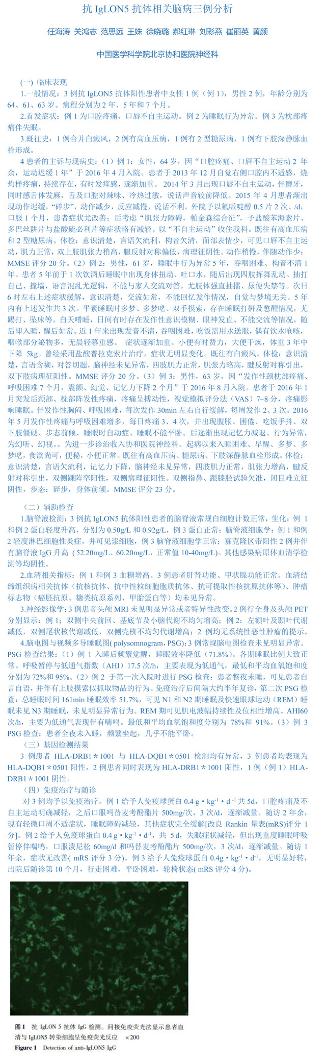 抗IgLON5抗体相关脑病,又称抗IgLON5综合征、抗IgLON5脑病,是一种罕见的中枢神经系统自身免疫性疾病。IgLON5属于细胞黏附分子免疫球蛋白家族,其中IgLON5主要表达于神经系统,基因位于人类 19号染色体,其功能尚不清楚。抗IgLON5抗体相关脑病属于抗神经元表面蛋白相关的自身免疫性脑炎,但与抗NMDAR脑炎等常见类型相比,该病临床表现独特,且具有tau蛋白病的神经病理改变。因此,该病被认为是连接神经系统自身免疫性疾病与神经变性病的桥梁,受到神经免疫学、神经变性病学和神经病理学等领域的关注[1-3]。该病首次于2014年由Dalmau研究团队发现并报道,国内首例由北京协和医院于2016年在J Neuroimmuno[1]上报道,截至目前全球累计报道20余例[2,4,5]。